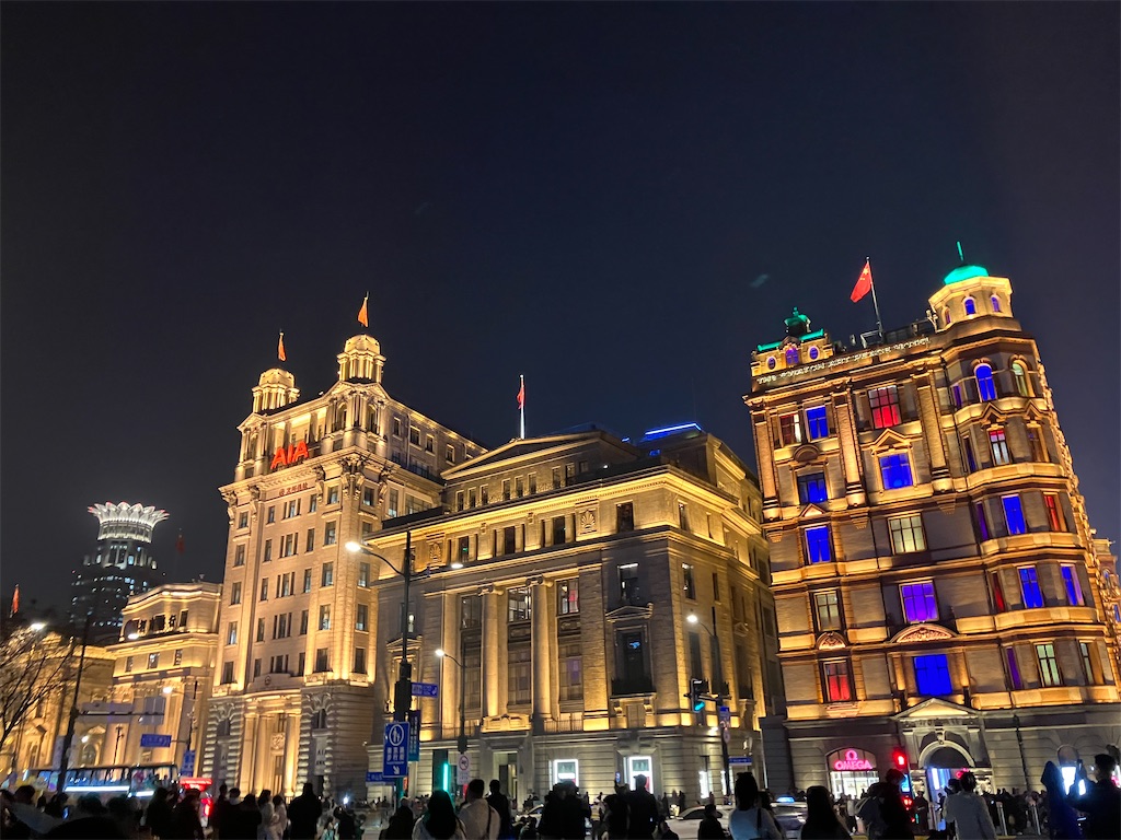 外灘(バンド)まで出ると西洋風の重厚な建物がライトアップされていました。ヨーロッパでも、これほどゴージャスな景観の都市はめったにありません。